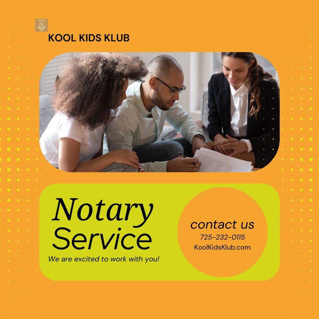 Traditional Notary Services: The classic you know, with a Kool Kids Klub twist! Perfect for your official documents, with the added guarantee of a smile.